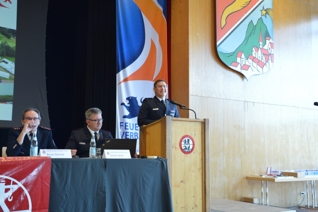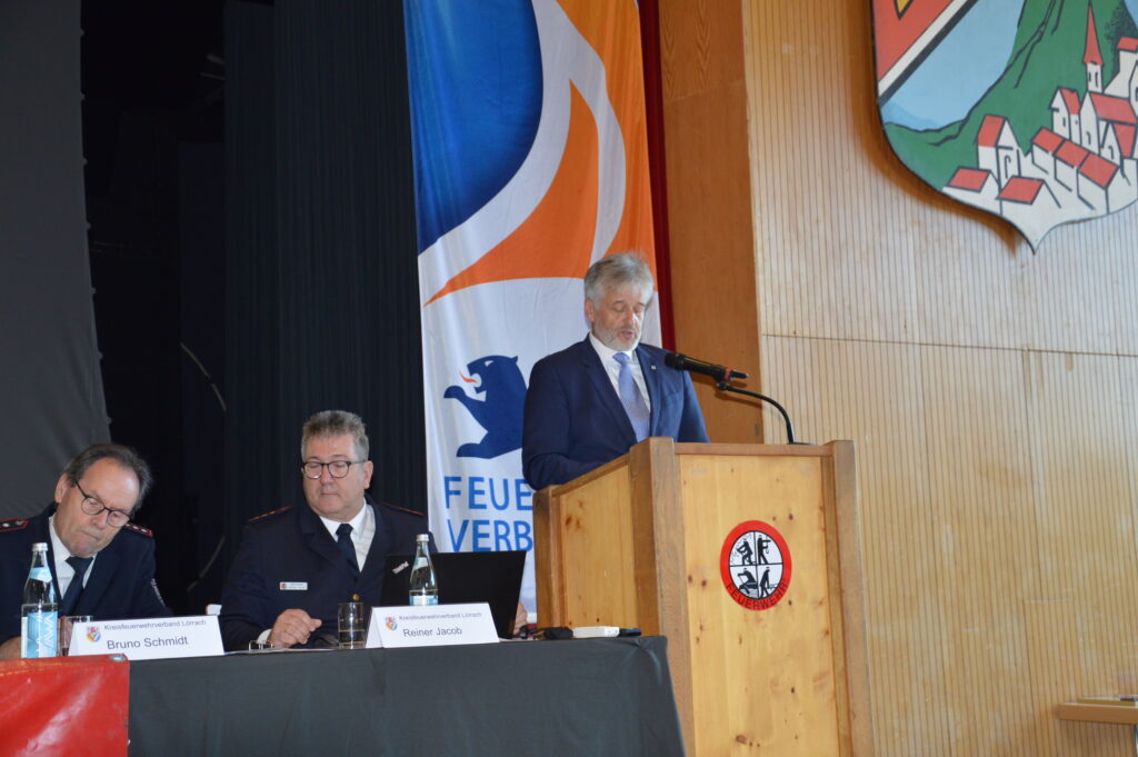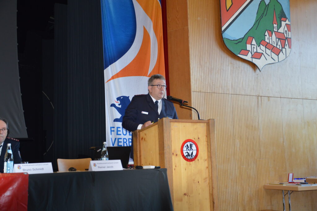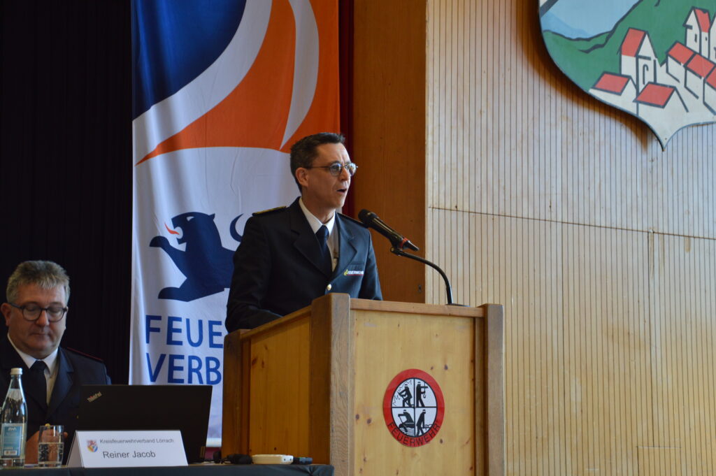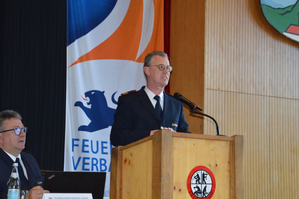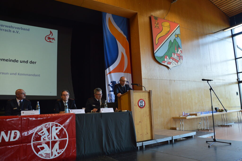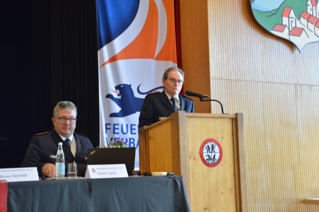 Zu Beginn der Versammlung spielte der Musikcorps der Feuerwehr Rheinfelden. Kreisverbandsvorsitzender Reiner Jacob konnte neben den zahlreich erschienenen Abordnungen der Feuerwehren aus dem Landkreis Lörrach, die beiden Stellvertretenden Kreisbrandmeister Claus Werner und Dietmar Fink, Vertreter des DRK Uwe Horschig, des THW Sebastian Pfeifer, der DLRG Stefanie Preusch, Mitglieder des Kreistags, Ehrenvorsitzenden Gerhard Salg, Klaus Merz den Vizepräsidenten des Landesfeuerwehr Verbandes Baden-Württemberg, Christoph Glaisner des Bezirksbrandmeister des Regierungsbezirks Freiburg, Bernd Schwöble KBM a.Dienst, Ralf Rieple vom KFV Waldtshut, Werner Schmidt stellv. KBM a.Dienst, Andreas Schaffhauser Verkehrspolizei Weil am Rhein, Wolfgang Hasler FW Brombach, Bürgermeister Günther Braun aus Steinen, Bürgermeister Mario Singer Malzburg-Marzell, Bürgermeisterin Simone Penner Kandern, Christian Renkert CDU Fraktion und Bürgermeister von Schliengen, Hans-Joachim Zabel ehem. Amt für Brand und Katastrophenschutz begrüßen. Bürgermeister Gunter Braun stellte die Gemeinde und Kommandant Walter Bachmann die Feuerwehr Steinen mit ihren sieben Abteilungen vor. Danach gab es ein Totengedenken welches musikalisch vom Musikcorps begleitet wurde. Kreisvorsitzender Reiner Jacob informierte über 79 Anlässe an denen er oder Vertreter vor Ort waren im zurückliegenden Jahr 2024. Im Jahr 2024 konnten insgesamt 48 Personen, sowie eine Firma aus dem Tätigkeitsbereich der Landkreisfeuerwehren und/oder aus internationalen Verbindungen der Wehren für außergewöhnliche bzw. gelebte Verdienste um das Feuerwehrwesen geehrt werden. Auch seitens der Vorstandschaft des Kreisfeuerwehrverbandes sowie dessen Fachgebiete und des Verbandsausschusses gab es zahlreiche Termine. Die Arbeit aus den Fachgebieten wurde von Dietmar Müller und Ingo Zahoransky bildlich vorgestellt. Besonders ist auch die Wichtigkeit des Fachgebietes Öffentlichkeit hervorgehoben worden, und im Fachbereich Frauenbeauftragte konnte man mit Sabrina Brunner wieder jemanden finden. Kai-Uwe Krieg gab Auskunft über die Jugendfeuerwehr für den verhinderten Kreisjugendfeuerwehrwart Markus Hasler. Es fand eine Delegiertenversammlung in Maulburg statt, ein Wettkampf für die Leistungsspange sowie einen Pokalwettkampf fand in Lörrach statt, an der Delegiertenversammlung in Konstanz war man Vertreten, das Größte und schönste Ereignis war das Kreiszeltlager in Schönau mit über 600 Jugendlichen. Kreisjugendfeuerwehrwart Markus Hasler wird sein Amt zur Verfügung stellen. Joachim Sahner informierte über die Jahresabschlüsse des KFV und der Kreisjugendfeuerwehr 2024 sowie über die Haushaltspläne 2025. Nach der Entlastung folgte die Genehmigung des Wirtschaftsplanes für 2025. Als Abschnittsvertreter für das Kleine-Wiesental ist jetzt Maximilian Trinler tätig. In Böllen wurde Robert Keller zum Kommandanten gewählt, in Bad-Bellingen Manuel Hummel, in Binzen Timo Schöpflin, in Grenzach-Wyhlen Sebastian Werner, bei der Werksfeuerwehr Aluminium Christian Maier. Als Abteilungskommandanten wurden in ihren Abteilungen gewählt: Jonas Schneider (Efringen-Kirchen-Wintersweiler), Florian Riehm (Schliengen- Eggenertal), Pierre Langendorf (Kleines Wiesental- Elbenschwand), Thorsten Tinschert (Kleines-Wiesental-Wies), Dominic Bauer (Schopfheim-Raitbach), Peter Kuder (Steinen-Hüsingen) und Florian Probst Zell-Gresgen). Reiner Jacob konnte einige langjährig verdiente Einsatzkräfte und sonstige Personen auszeichnen sowie verabschieden. So wurden mit der Ehrengabe in Gold des Kreisfeuerwehrverbandes Lörrach: Enrico Leipzig (10 Jahre Abt. Kommandant Rheinfelden Stadt), Rudolf Streule (33 Jahre Abt. Kommandant Rheinfelden Nollingen), Rene Bauer (25 Jahre Abt. Kommandant Kleines-Wiesental Elbenschwand), Markus Schleith (25 Jahre Abt. Kommandant Zell Gresgen), Matthias Müller (18 Jahre Abt. Kommandant Schliengen Obereggenen), Patrick Schöpflin (15 Jahre Kommandant Binzen) und Jürgen Engler ( 12 Jahre Abt. Kommandant Weil am Rhein Haltingen) ausgezeichnet. Die Ehrengabe in Silber konnte Florian Kammerer (10 Jahre Abt. Kommandant Efringen-Kirchen Wintersweiler) entgegennehmen. Ebenso konnte Reiner Jacob Jürgen Räuber (Ortsvorsteher von Rheinfelden-Karsau für seine Unterstützung im Feuerwehrwesen) mit der Ehrennadel in Silber nebst Urkunde und Bandschnalle des KFV Lörrach überreichen. Werner Mühlhaupt ist seit 40 Jahren Leiter des Musikcorps der Feuerwehr Rheinfelden und wurde mit der Goldenen Ehrennadel des KFV nebst Urkunde ausgezeichnet. Heinz Hemmer aus Efringen-Kirchen wurde mit der Silbernen Ehrenmedaille des Landesfeuerwehrverbandes Baden-Württemberg nebst Urkunde für 65 Jahre aktiven Dienst ausgezeichnet. Mit dem Ehrenkreuz in Silber des Deutschen Feuerwehrverbandes für 46-Jährigen aktiven Dienst wurde Lothar Schleith aus Steinen-Schlächtenhaus ausgezeichnet. Der Stellvertretende Kreisbrandmeister Dietmar Fink überbrachte die Grüße des Kreisbrandmeisters Uwe Häubner und des Landratsamtes. Er bedankte sich bei allen Wehrangehörigen für ihre aufgeopferte Zeit zum Wohle der Allgemeinheit. Im zurückliegenden Jahr konnte im Landkreis 30 neue Gruppenführer ausgebildet werden. „Neue Führungskräfte sichern die Einsatzfähigkeit unserer Feuerwehren“ betonte er. Bezirksbrandmeister Christoph Glaisner gab einen kurzen Bericht über die Überarbeitung des baden-württembergischen Feuerwehrgesetzes welches Hoffnung auf mehr Fortbildungen und kürzere Wartezeiten mache, denn die Landesfeuerwehrschule in Bruchsal sei ausgeweitet worden. Danach überbrachte Claus Merz die Grußworte des Landesfeuerwehrverbandes. Nach den Grußworten bedankte sich Reiner Jacob bei alle Vorstandsmitgliedern, der Feuerwehr Steinen für die Bewirtung, dem Kreisbrandmeister Uwe Häubner sowie dem KBM Büro vor allem bei Tina Keller sowie den Partnern der Vorstandsmitglieder. Bruno Schmidt Stellvertretender Verbandsvorsitzender bedankte sich bei Reiner Jacob