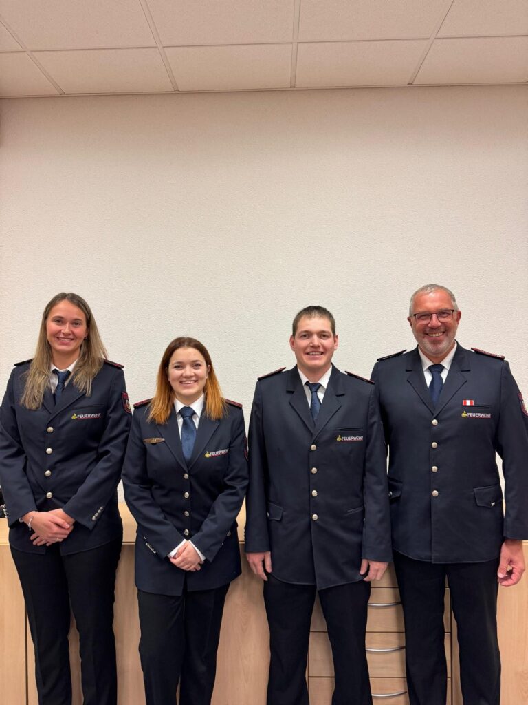 Foto von links: Ann-Kathrin Rümmele ( Stellvertredende Jugendwartin), Svenja Kiefer ( Jugendwartin), Florian Kiefer ( ehemaliger Jugendwart) und Kommandant Wolfgang Köpfer.